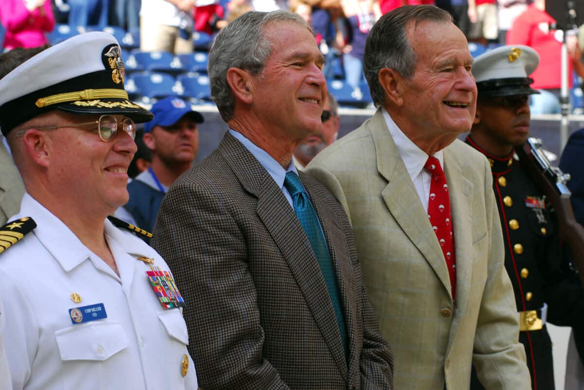 - Source URL: https://en.wikipedia.org/wiki/File:US_Navy_091025-N-1854W-228_The_Commanding_Officer_of_USS_George_H.W._Bush_(CVN_77)_Capt._Chip_Miller,_left,_and_Presidents_George_W._Bush,_center,_and_George_H.W._Bush.jpg