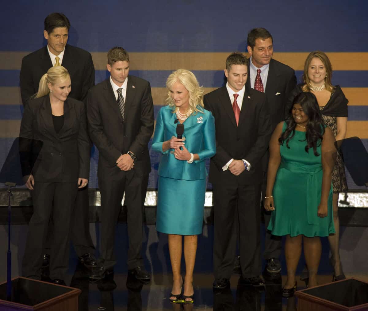 - Source URL: https://en.wikipedia.org/wiki/File:Republican_National_Convention,_September_1-4,_2008._Presidential_candidate_John_McCain%27s_family,_wife_Cindy_in_the_middle_in_green_outfit,_St._Paul,_Minnesota_LCCN2010719276_(cropped1).jpg