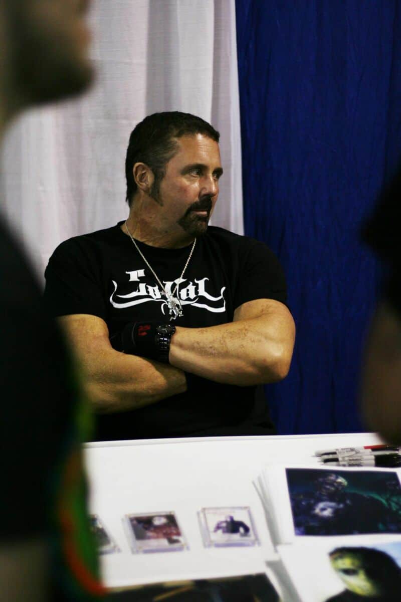 | Curiosities and Trademarks | Wears gloves at signing events, so he does not "leave fingerprints." In actuality, the gloves are worn to cover burn marks from a stunt mishap in the 1980s. Towering height and muscular physique Wearing a custom charm of the Insane Clown Posse's "hatchetman" logo holding a machete instead of a hatchet, a reference to his role as Jason Voorhees Often plays killers in films Heavy scarring on his neck (the result of a stunt mishap) |