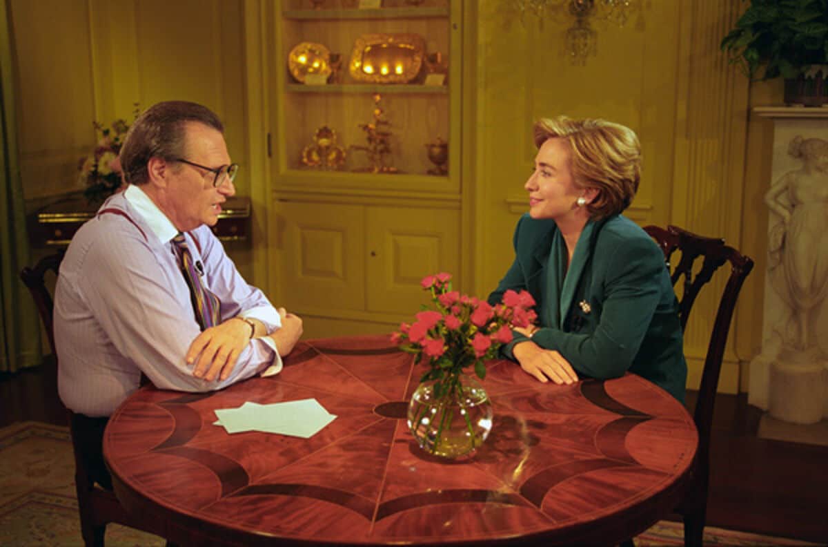 - Source URL: https://en.wikipedia.org/wiki/File:Photograph_of_First_Lady_Hillary_Rodham_Clinton_Taping_a_Larry_King_Weekend_Show_-_NARA_-_3668097.jpg